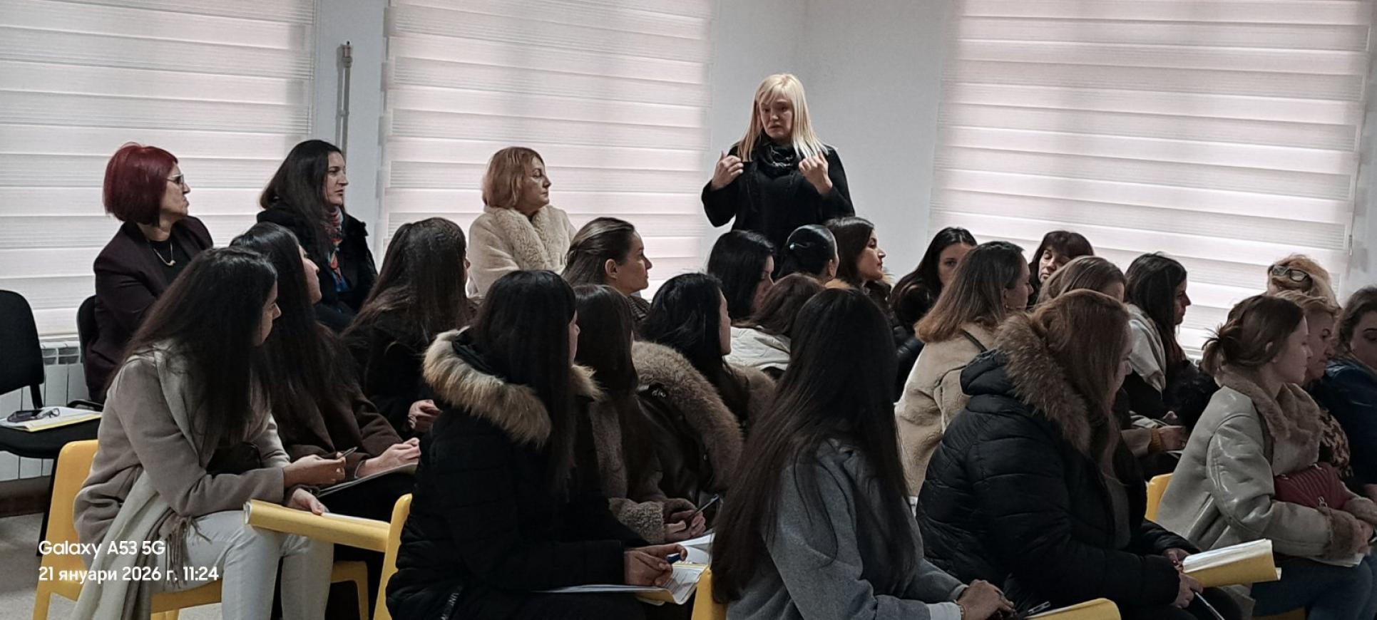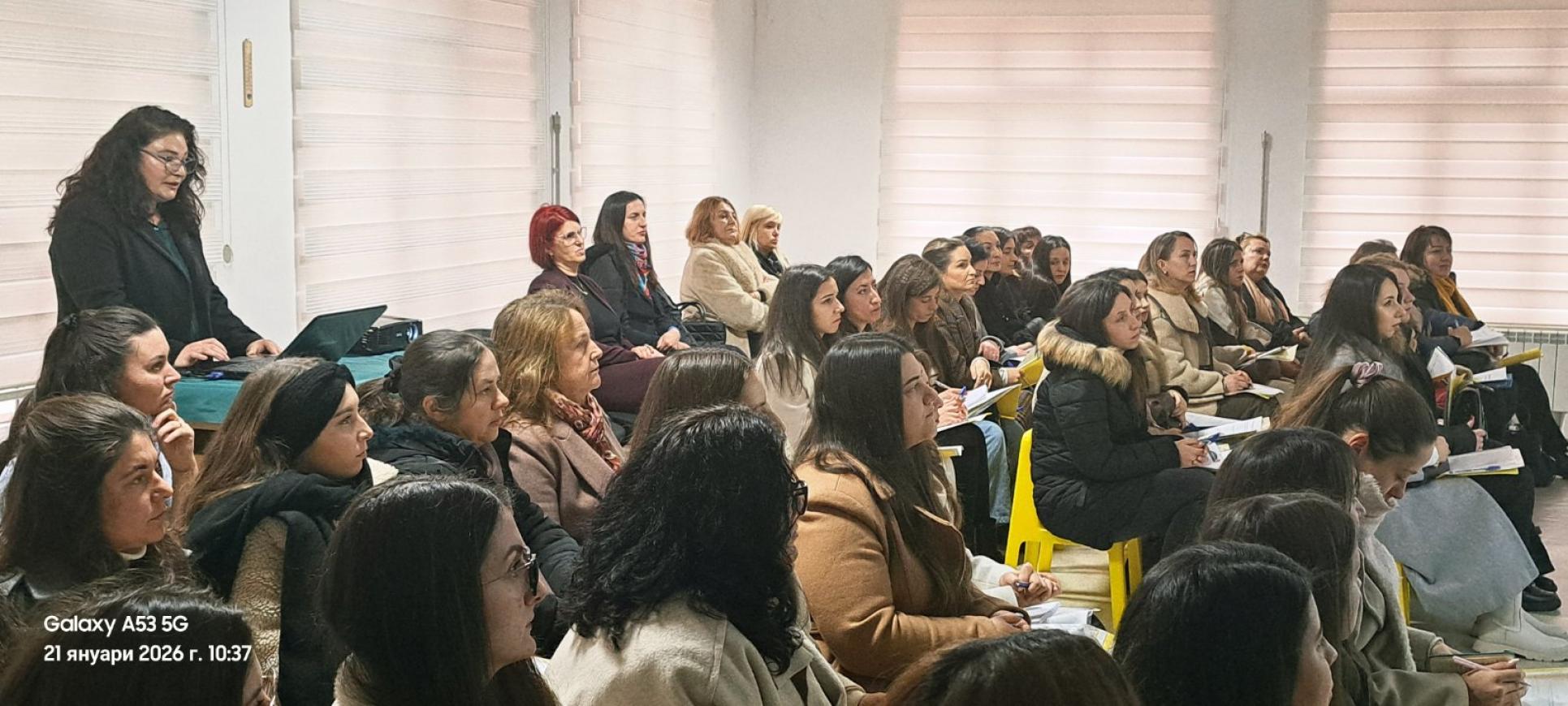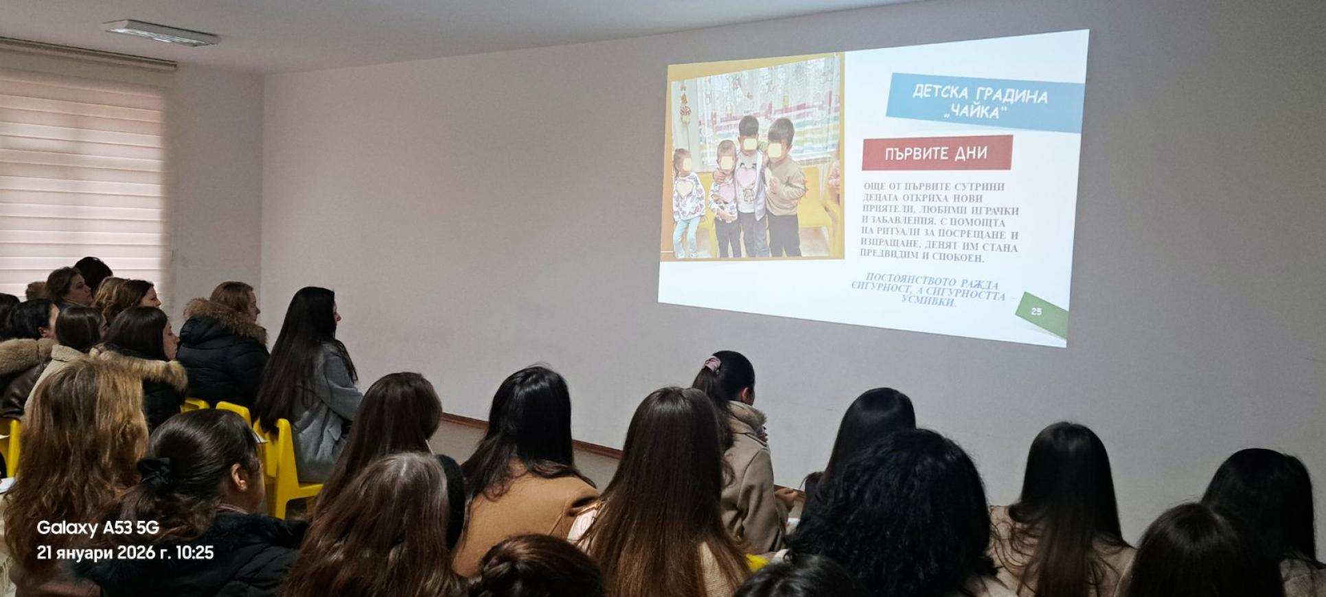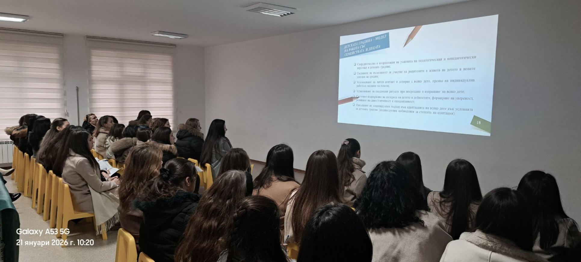Фотогалерия » 21.01.2026г. Работна среща с педагогически специалисти от предучилищното образование на тема: "Споделяне на модели за намаляване на тревожността на родителите при постъпване на детето в детската градина и успешната му адаптация"